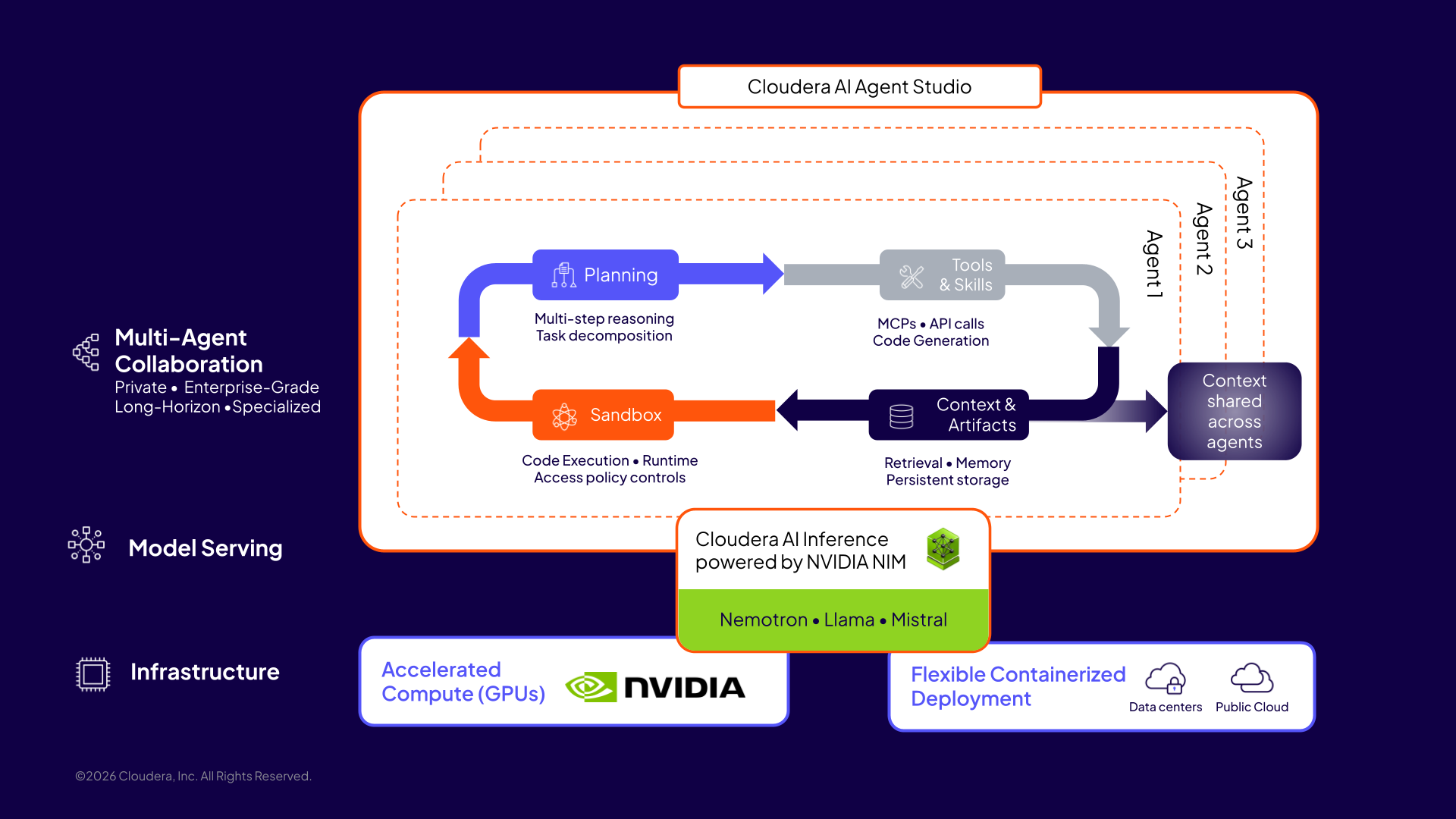 图 1:Cloudera Agent Studio 通过迭代多步规划、多智能体与工具和技能协作、工件驱动的上下文工程以及沙盒执行来协调自主工作流程——构建于 Cloudera AI Inference(由 NVIDIA NIM 提供支持)的模型服务基础之上,并采用 Nemotron 代理型人工智能。